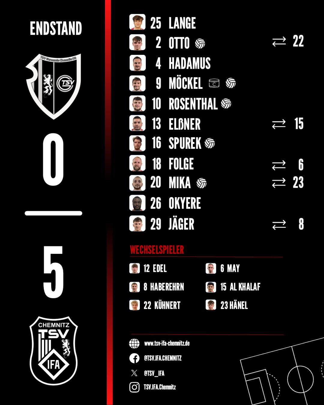 zur News ÜbersichtMit drei weiteren Punkten auf der Habenseite kehrten wir am Sonntag vom Auswärtsspiel beim TSV Germania Chemnitz heim. Anders als es das Ergebnis auf den ersten Blick vielleicht vermuten lässt, verlief die Begegnung gerade in der ersten Halbzeit keineswegs so deutlich in unsere Richtung.