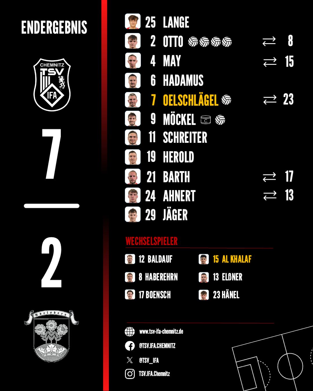 Nach dem Seitenwechsel machten wir direkt dort weiter, wo wir zuvor aufgehört hatten: Einem hohen Ballgewinn von Herold folgte der Pass auf den startenden Oelschlägel, wobei Keeper Ziems dessen Abschluss noch entschärfen konnte. Gegen Ottos Nachschuss war er dann aber machtlos (46‘). Am Spielgeschehen änderte sich auch in der Folge nichts, jedoch schafften wir es vorerst nicht mehr, vielversprechendste Gelegenheiten in Zählbares umzuwandeln. Dazu gehörten auch die Aluminiumtreffer Nr. 3 und 4 durch Möckel (letzterer per direktem Freistoß) sowie ein verschossener Elfmeter. In der Schlussviertelstunde gingen uns Spannung und Konzentration dann etwas verloren, wodurch unsere Gäste zu einigen Umschaltsituationen kamen. Immerhin durfte sich Lange in einer dieser Situationen nochmal auszeichnen, als er ein fast schon sicheres Tor aus dem Eck kratzte. In Minute 87 belohnte sich dann endlich auch Kapitän Möckel für seinen unermüdlichen Einsatz – sein leicht abgefälschter Schuss war für Ziems nicht zu halten. Mehr oder weniger im direkten Gegenzug nutzte Adelsberg eine der sich nun häufenden Unachtsamkeiten zur 7:2-Ergebniskosmetik (88‘).