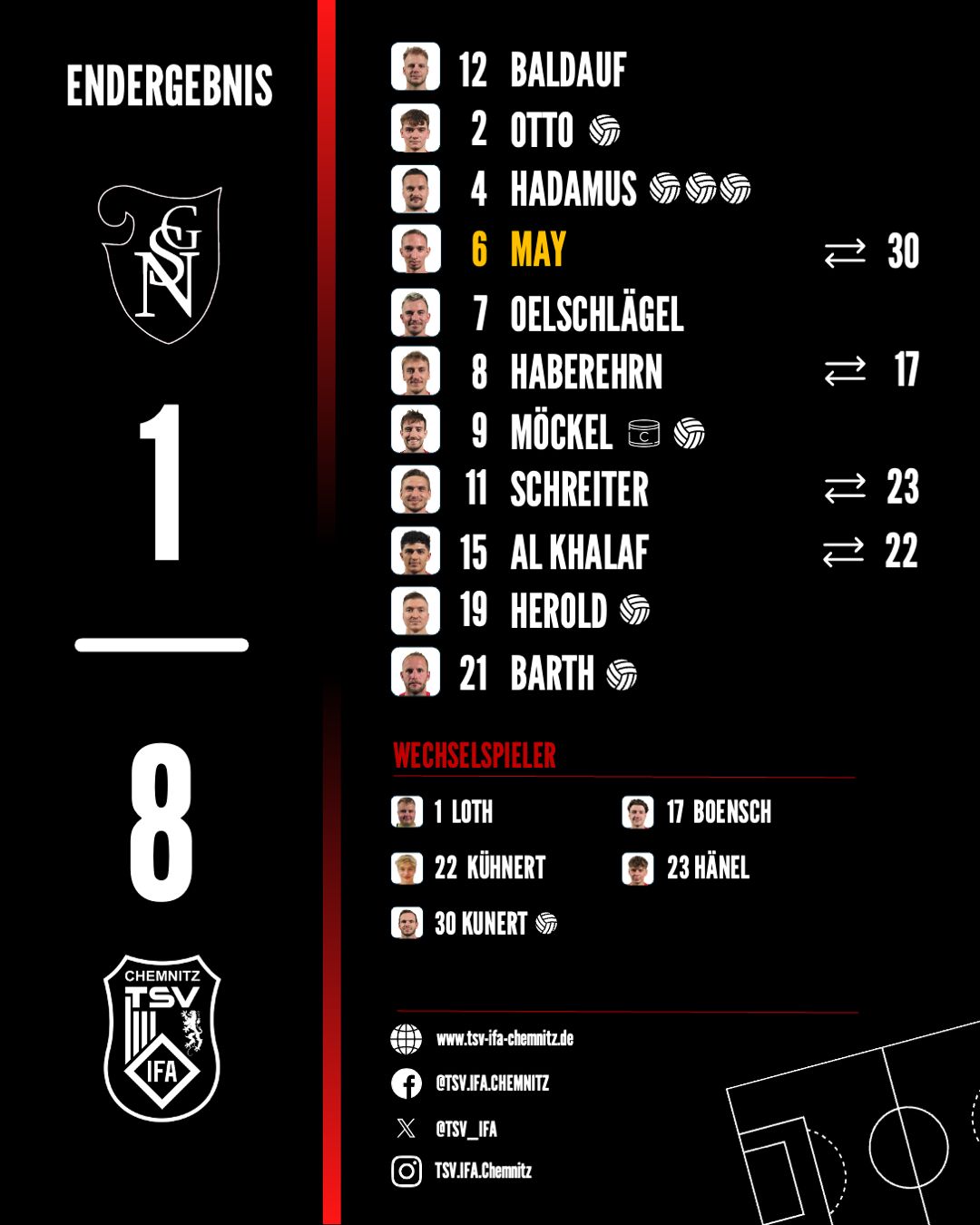 Der zweite Durchgang hätte aus unserer Sicht nicht besser beginnen können. Möckel erhöhte direkt mit dem ersten Angriff auf 4:0 und beseitigte somit schnell alle möglichen Restzweifel hinsichtlich eines Sieges an diesem Tag. Barth kraftvoll per Kopf nach Freistoß Hadamus (65‘), Herold mit einem traumhaften Freistoß in den Winkel (77‘), Kunert nach herrlicher Einzelleistung eiskalt (80‘) sowie nochmals Hadamus mit einem Abstauber aus Nahdistanz (87‘) schraubten das Ergebnis in die Höhe. Lowke sorgte dabei zwischenzeitlich für die verdiente Ergebniskosmetik nach einer Ecke (68‘).